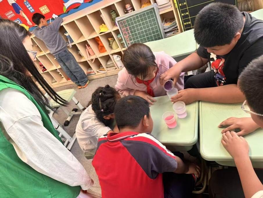 在动手实验环节,志愿者为每位同学分发紫甘蓝、透明杯子、白醋、小苏打水、清水等实验材料,并细致讲解操作步骤与安全注意事项。在志愿者的指导下,同学们小心翼翼地将紫甘蓝汁液分别滴入清水、白醋、小苏打水中,见证奇妙的变色现象:紫甘蓝汁遇清水保持原色,遇白醋变为红色,遇小苏打水变为蓝色。直观的色彩变化让孩子们惊叹不已,大家积极提问、踊跃分享,现场气氛热烈。志愿者趁热打铁,揭秘紫甘蓝作为天然酸碱指示剂的科学原理,将实验现象与酸雨危害、水体酸碱污染等知识紧密结合,让同学们在玩中学、学中悟。
